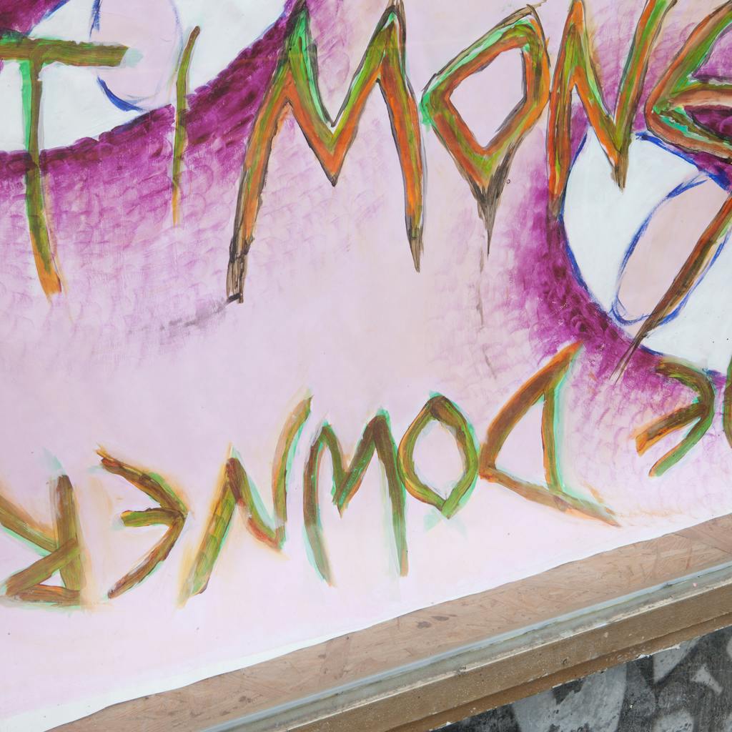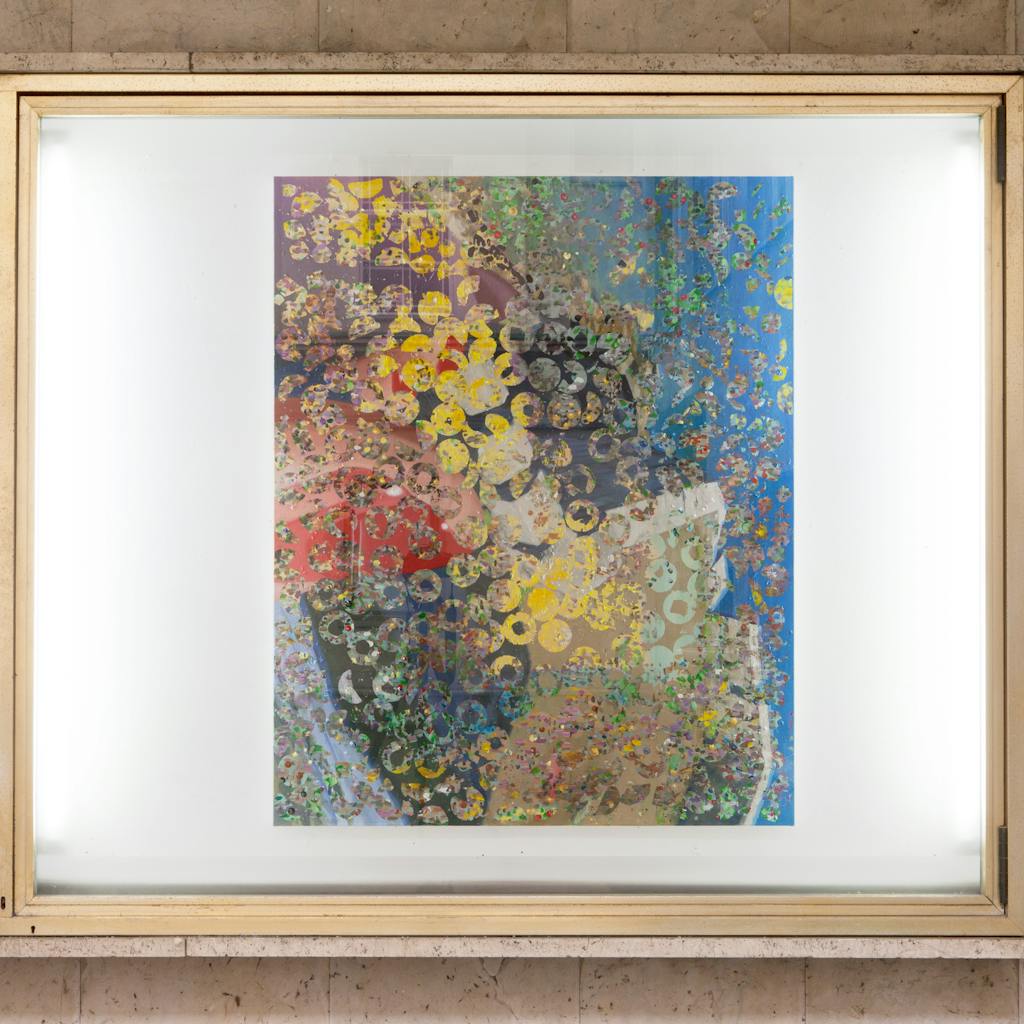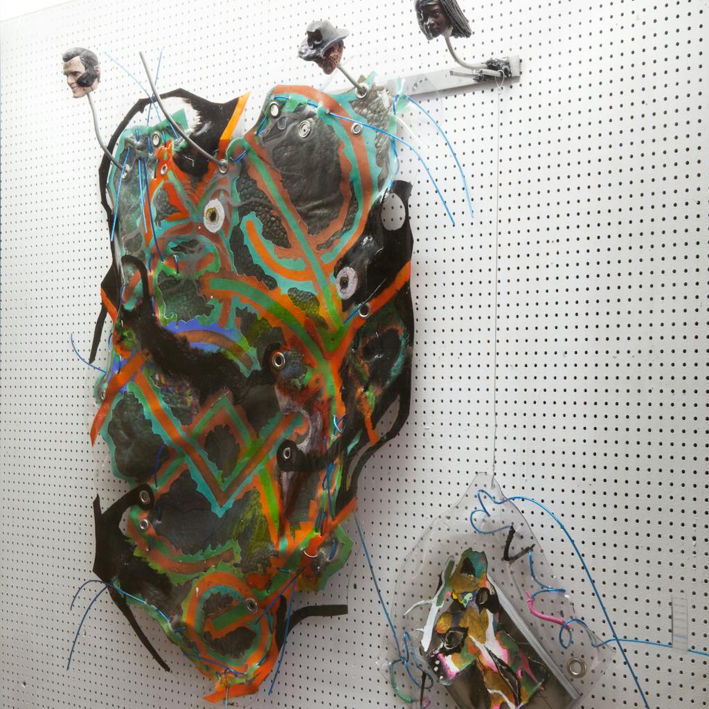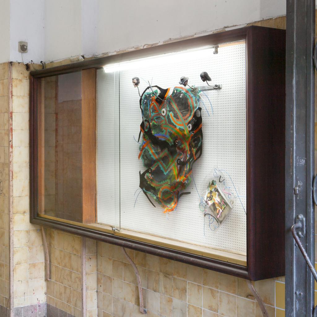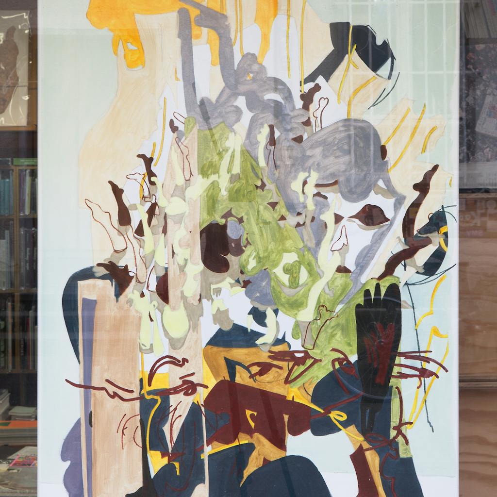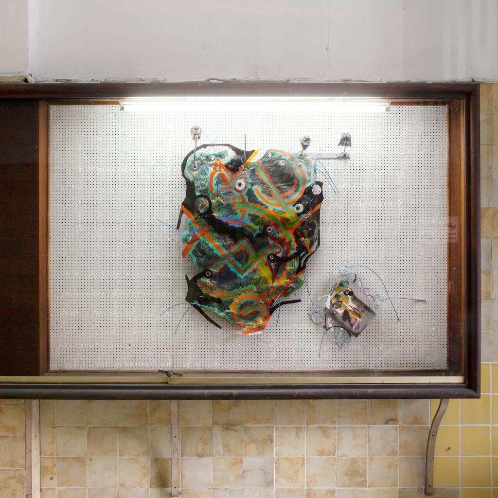 KAYA’s (Kerstin Brätsch & Debo Eilers) talismanic paintings caricaturize authorship, surface, support, brushstroke and reception — essentially every structural aspect of the medium. Often painted on transparent mylar that shows whatever is behind it, the painted surface is not some window into a mimetic fiction, but rather, like a real window, a view onto whatever it’s hanging in front of. They are also usually tied or strapped down, as if they could escape without being restrained. Or maybe the hardware is functional, as the artists and their interlopers have dragged these types of things down the dirt roads of a Western-themed film set Agoura Hills, hauled them up to a mountaintop in Austria and lashed them to the side of a miniature house in more cities than one. It’s almost as if they are trying to assert that an object can also have an experiential memory — or even begin to have an inkling of its place within the timeline of humanity crafting objects with no concrete function. KAYA’s works are collectivized first through the partnership between Brätsch and Eilers, then further displaced by the pretense that this collaboration is named after a third person, a real Kaya, who is implicated as a muse, co-author, or recipient of the works created by the other KAYA. In this instance — and in a number of other recent bodies of work — the graffiti artist N.O.Madski joins the collective. Graffiti adds another confounding metaphor to the mix: it is something unwittingly seen by many but generally sought after by few.