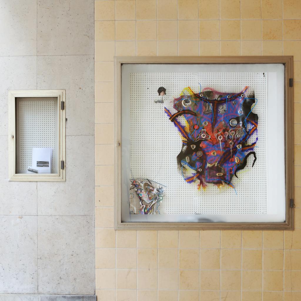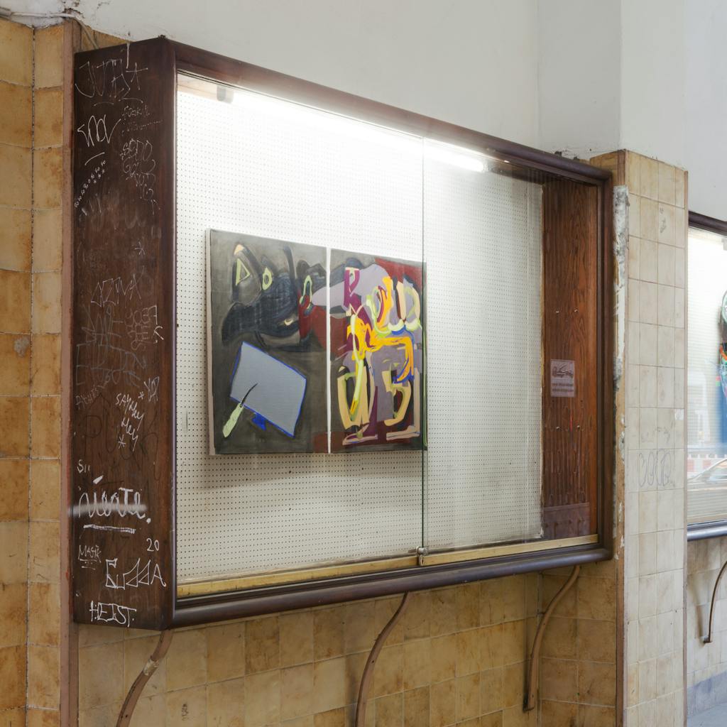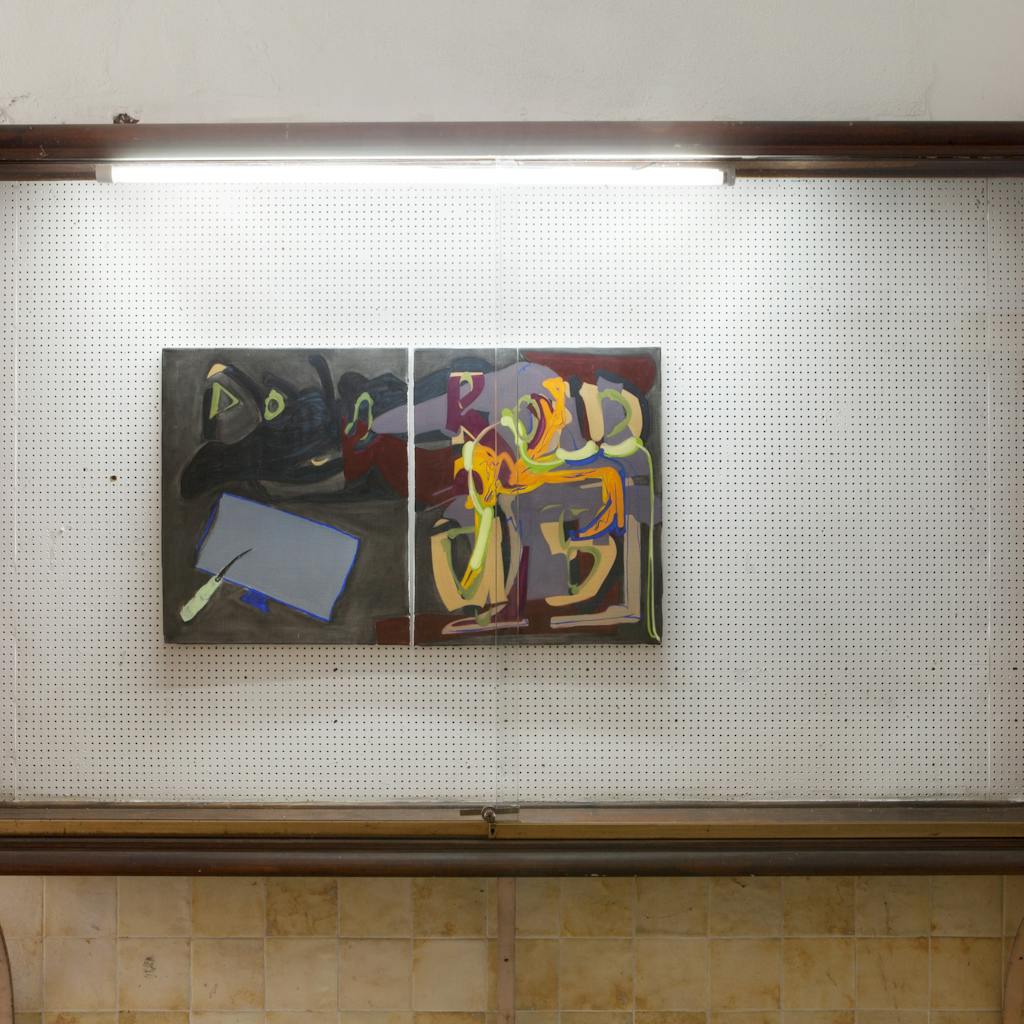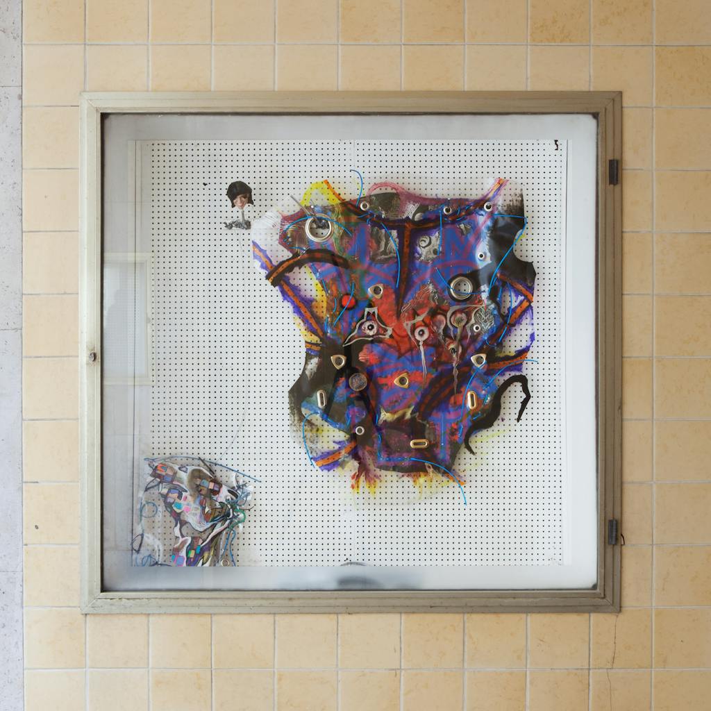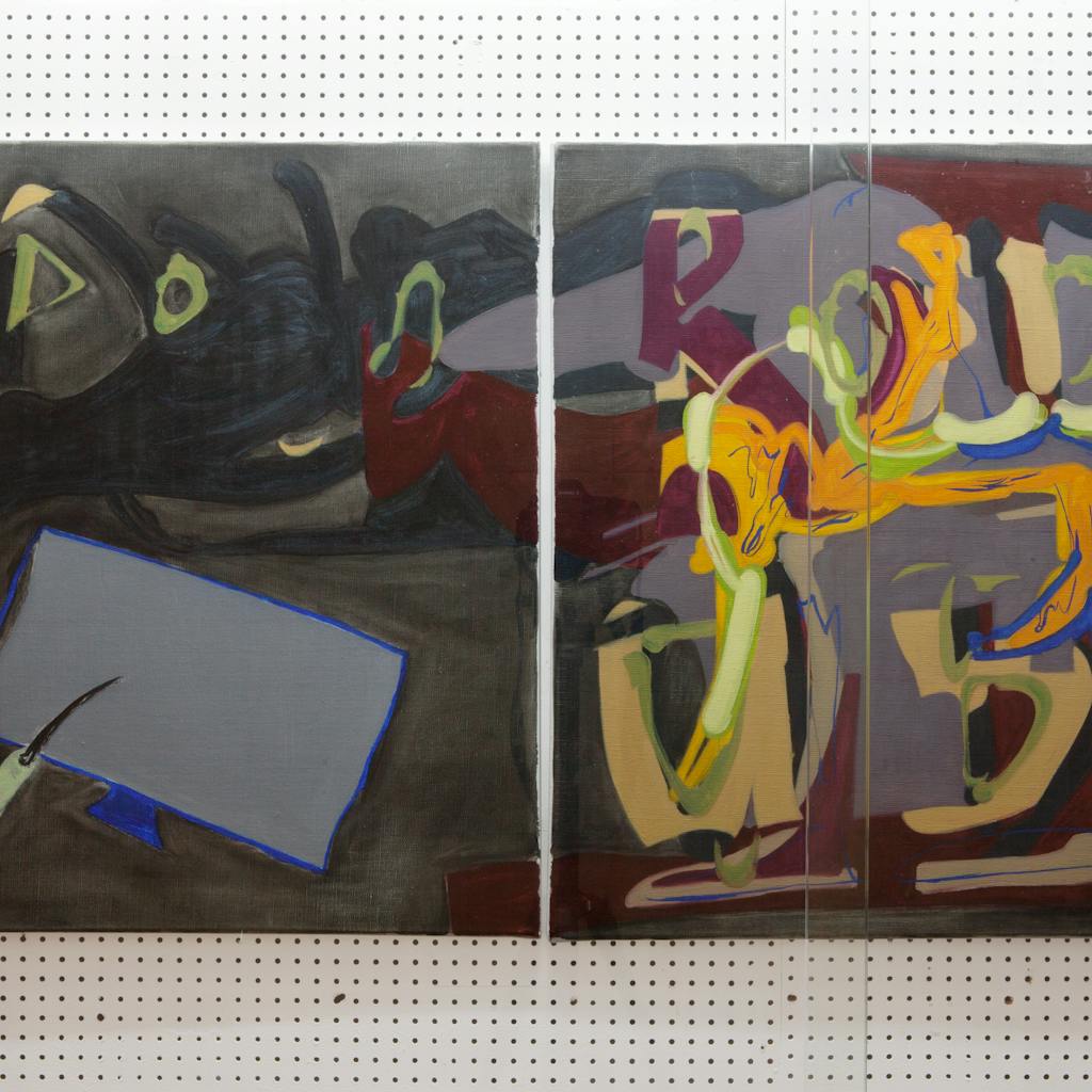 KAYA’s (Kerstin Brätsch & Debo Eilers) talismanic paintings caricaturize authorship, surface, support, brushstroke and reception — essentially every structural aspect of the medium. Often painted on transparent mylar that shows whatever is behind it, the painted surface is not some window into a mimetic fiction, but rather, like a real window, a view onto whatever it’s hanging in front of. They are also usually tied or strapped down, as if they could escape without being restrained. Or maybe the hardware is functional, as the artists and their interlopers have dragged these types of things down the dirt roads of a Western-themed film set Agoura Hills, hauled them up to a mountaintop in Austria and lashed them to the side of a miniature house in more cities than one. It’s almost as if they are trying to assert that an object can also have an experiential memory — or even begin to have an inkling of its place within the timeline of humanity crafting objects with no concrete function. KAYA’s works are collectivized first through the partnership between Brätsch and Eilers, then further displaced by the pretense that this collaboration is named after a third person, a real Kaya, who is implicated as a muse, co-author, or recipient of the works created by the other KAYA. In this instance — and in a number of other recent bodies of work — the graffiti artist N.O.Madski joins the collective. Graffiti adds another confounding metaphor to the mix: it is something unwittingly seen by many but generally sought after by few.