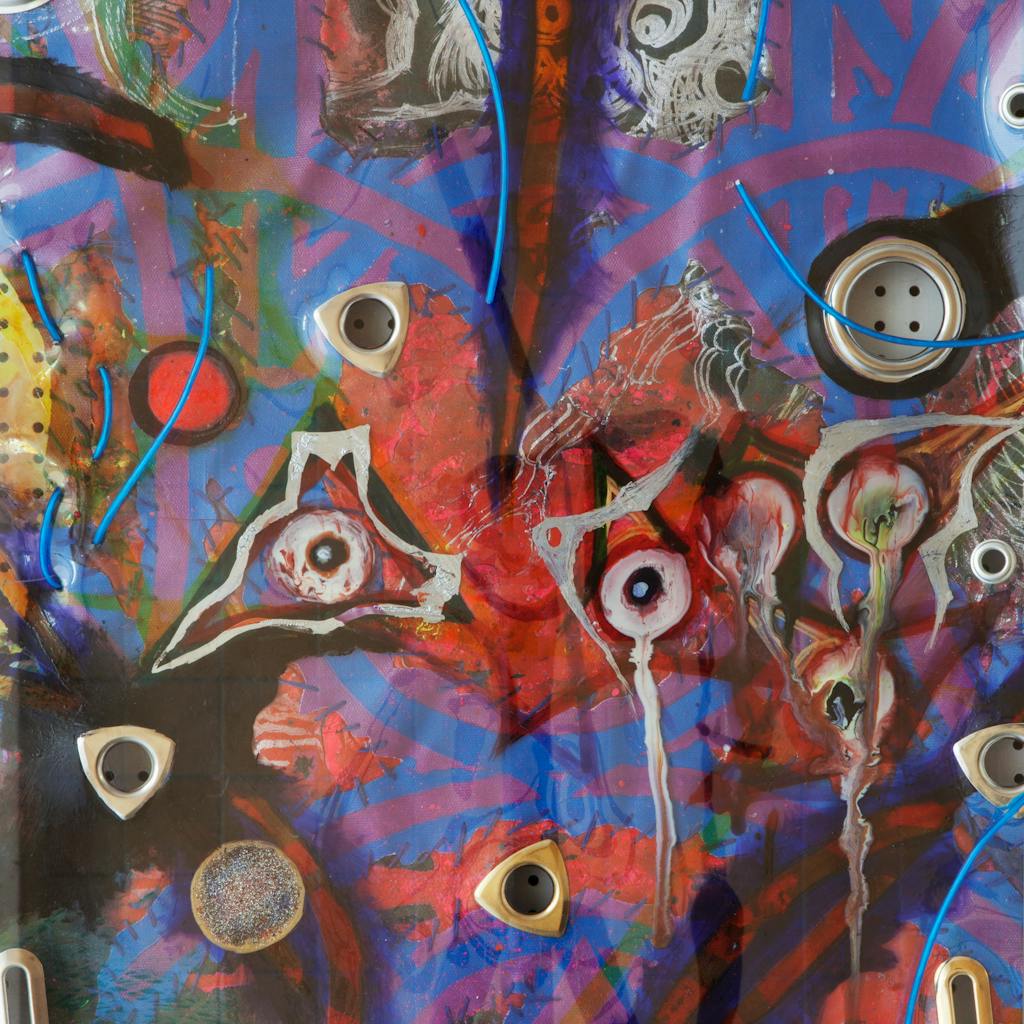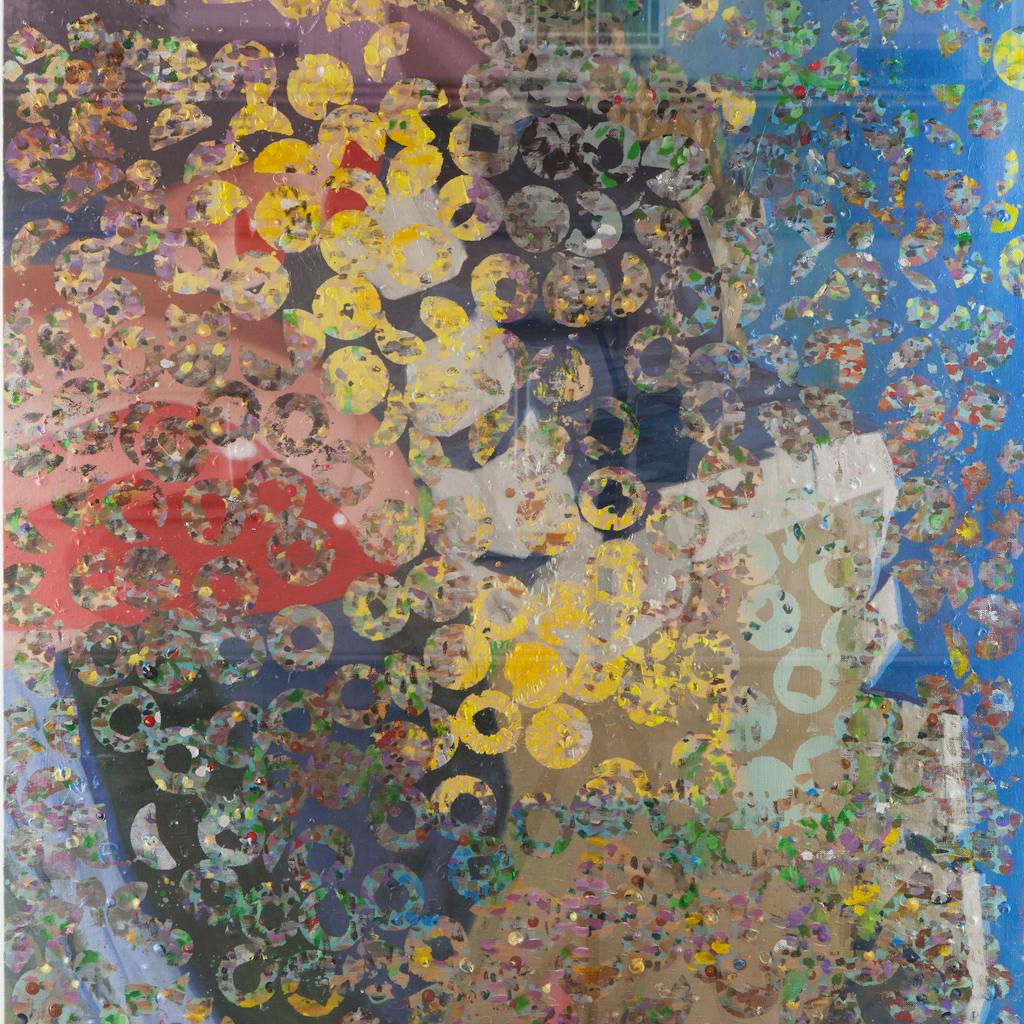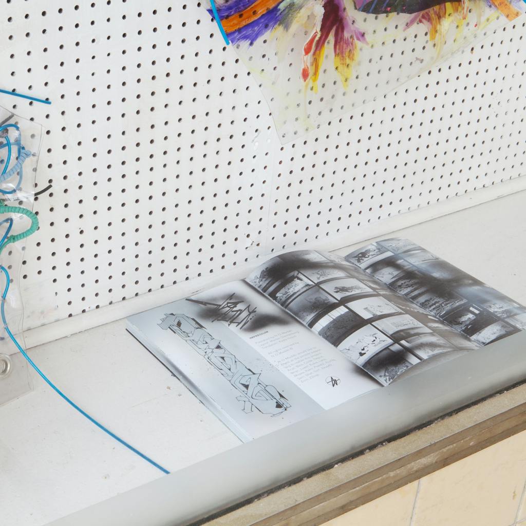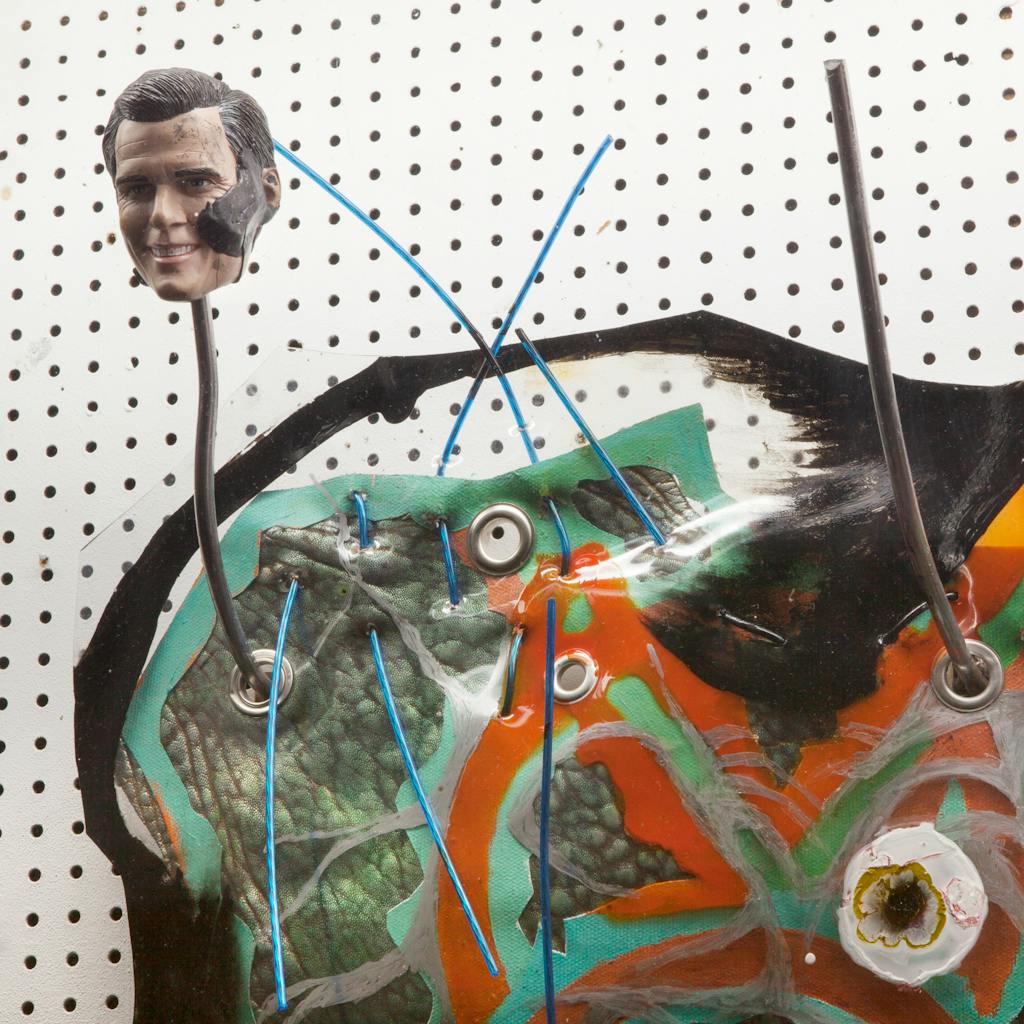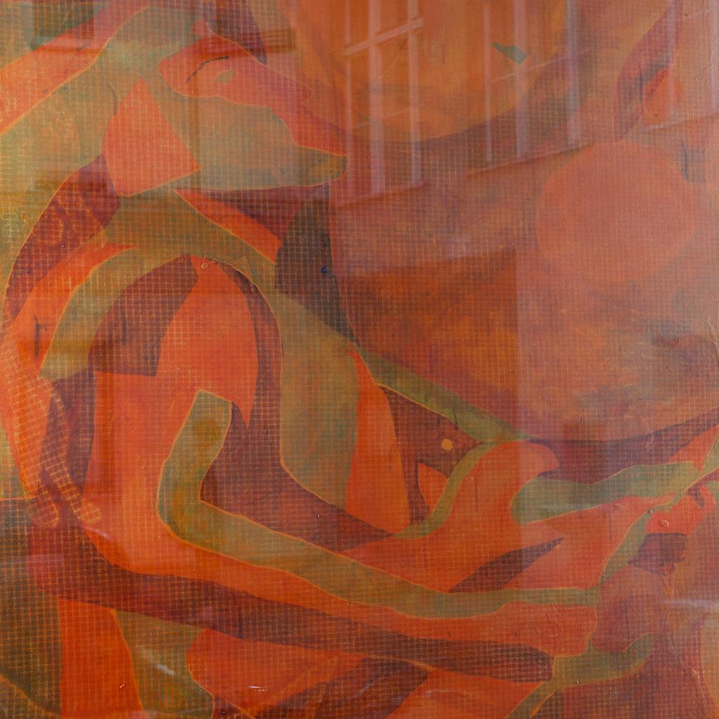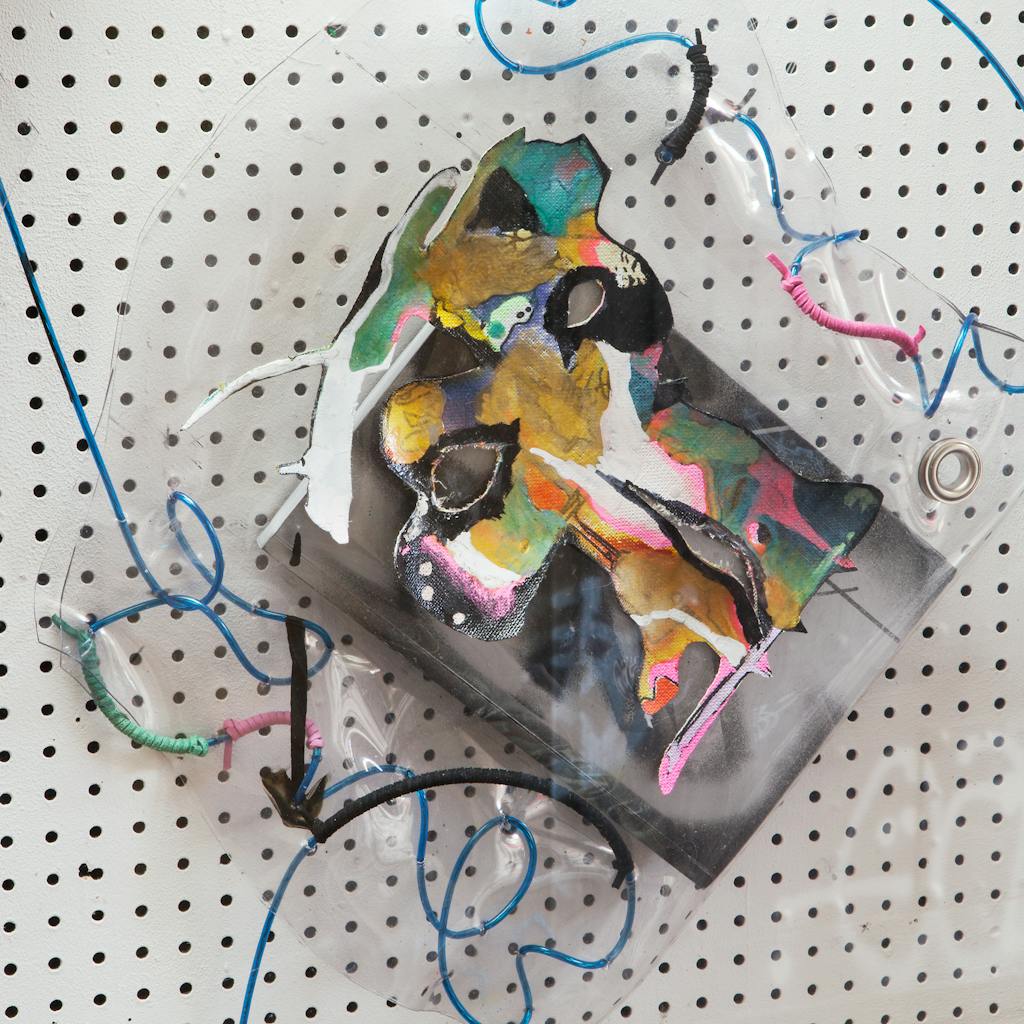 KAYA’s (Kerstin Brätsch & Debo Eilers) talismanic paintings caricaturize authorship, surface, support, brushstroke and reception — essentially every structural aspect of the medium. Often painted on transparent mylar that shows whatever is behind it, the painted surface is not some window into a mimetic fiction, but rather, like a real window, a view onto whatever it’s hanging in front of. They are also usually tied or strapped down, as if they could escape without being restrained. Or maybe the hardware is functional, as the artists and their interlopers have dragged these types of things down the dirt roads of a Western-themed film set Agoura Hills, hauled them up to a mountaintop in Austria and lashed them to the side of a miniature house in more cities than one. It’s almost as if they are trying to assert that an object can also have an experiential memory — or even begin to have an inkling of its place within the timeline of humanity crafting objects with no concrete function. KAYA’s works are collectivized first through the partnership between Brätsch and Eilers, then further displaced by the pretense that this collaboration is named after a third person, a real Kaya, who is implicated as a muse, co-author, or recipient of the works created by the other KAYA. In this instance — and in a number of other recent bodies of work — the graffiti artist N.O.Madski joins the collective. Graffiti adds another confounding metaphor to the mix: it is something unwittingly seen by many but generally sought after by few.